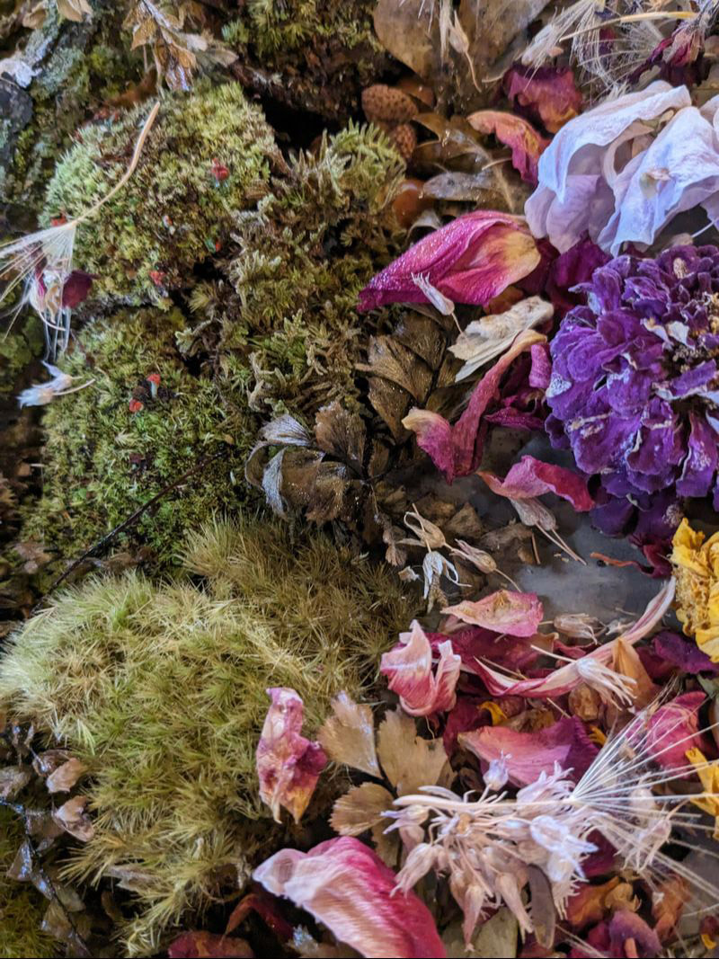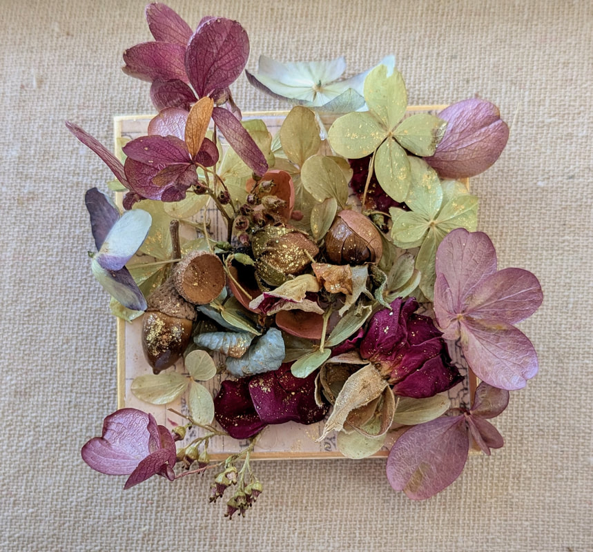 Using her long time collection of gathered plant materials, she printed their images and shadows by placing them directly on the inked plate and printing on one of a selection of archival papers. Many images of the work Susan created during this time is viewable on her Fine Art Website. Beginning in 2021 Susan experimented with her original paper paintings and materials from her collections of dried plants and flowers, to create 3d collagés.